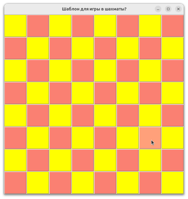 playground = ['yellow', 'salmon'] * (cols // 2) # значение определяет цвет клетки